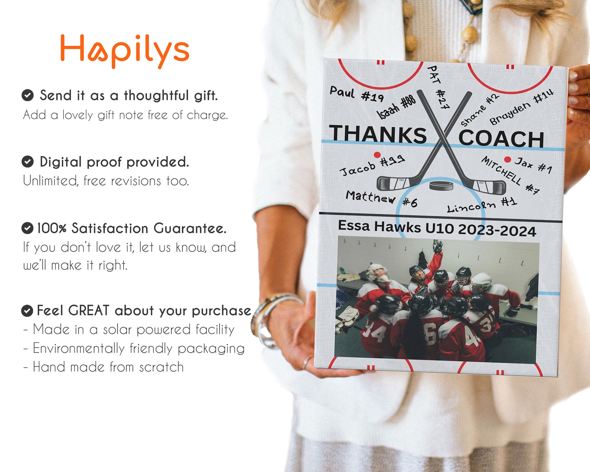 I couldn't be happier with this personalized gift I ordered for my son's hockey coaches! The quality was outstanding and every detail was beautifully done. It was the perfect way to capture such special memories. This company was an absolute pleasure to work with-responsive, professional and truly dedicated to making sure everything was exactly how I envisioned. I highly recommend Hapilys to anyone looking for a unique and heartfelt gift!