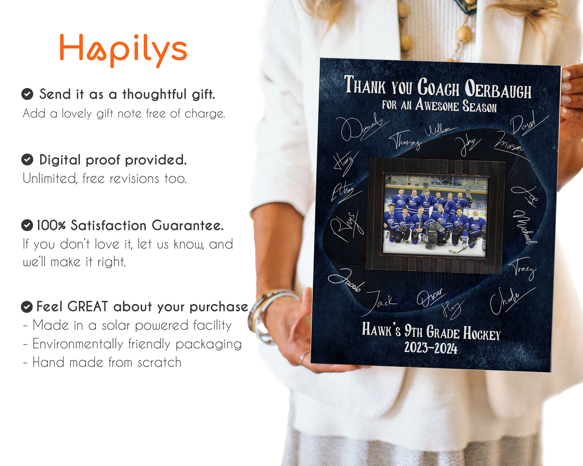 I couldn't be happier with this personalized gift I ordered for my son's hockey coaches! The quality was outstanding and every detail was beautifully done. It was the perfect way to capture such special memories. This company was an absolute pleasure to work with-responsive, professional and truly dedicated to making sure everything was exactly how I envisioned. I highly recommend Hapilys to anyone looking for a unique and heartfelt gift!