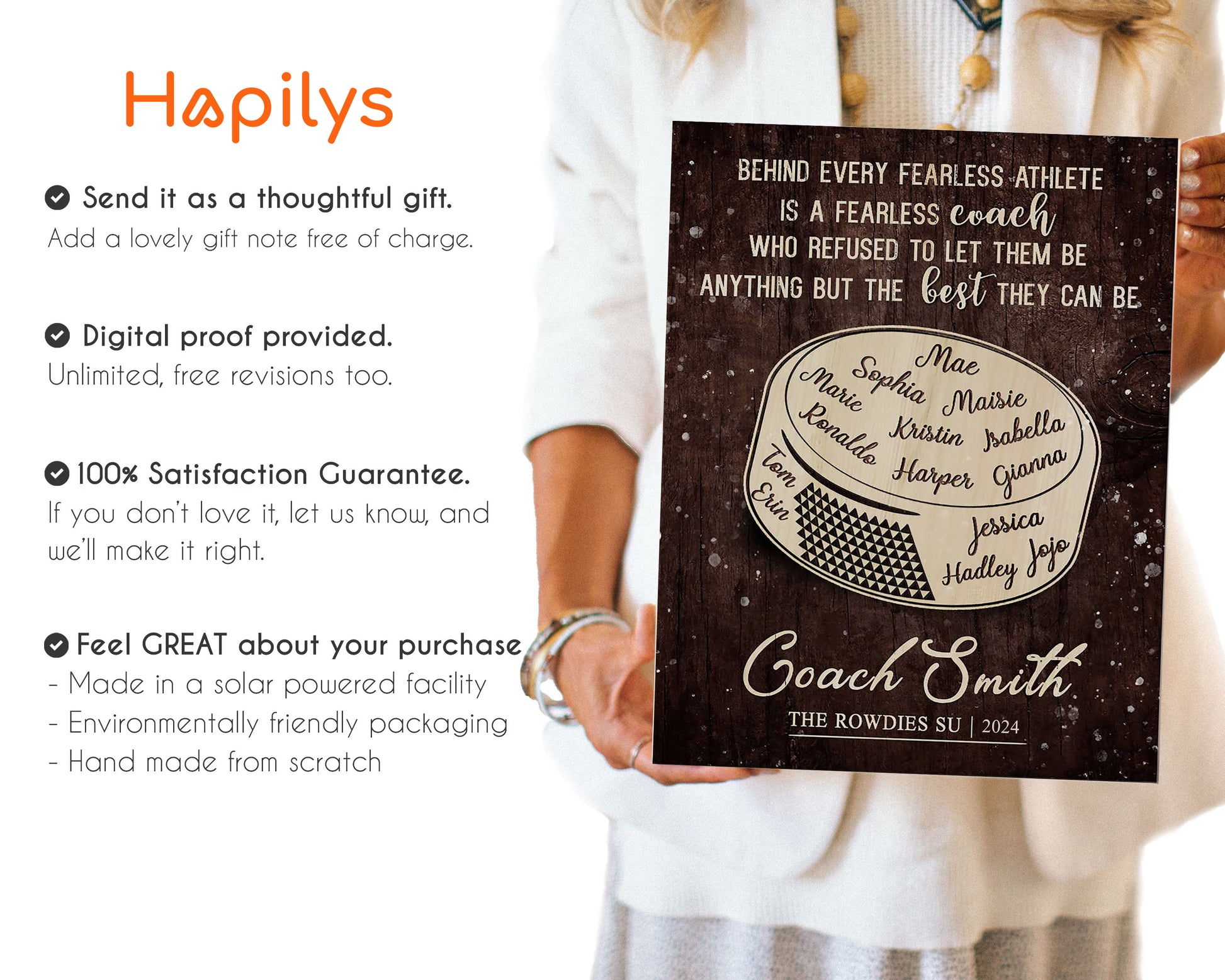 I couldn't be happier with this personalized gift I ordered for my son's hockey coaches! The quality was outstanding and every detail was beautifully done. It was the perfect way to capture such special memories. This company was an absolute pleasure to work with-responsive, professional and truly dedicated to making sure everything was exactly how I envisioned. I highly recommend Hapilys to anyone looking for a unique and heartfelt gift!